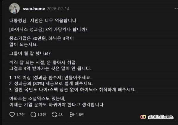 "하이닉스 성과급에 억울하다는 시민" 페이지 정보 작성자 pkg 댓글 0건 조회 330회 작성일 26-04-16 01:40 목록 답변 글쓰기 본문 1. 1억이상 성과급 환수제 2. 성과급의 80%는 세금 3. 일반국민들도 하이닉스 취직 ??? 이전글며칠전 위스키 갤러리에서 있었던 위스키 슈킹? 사건 26.04.16 다음글최신자 대한민국 도시 인구 순위 26.04.16 댓글 0 댓글목록 등록된 댓글이 없습니다.