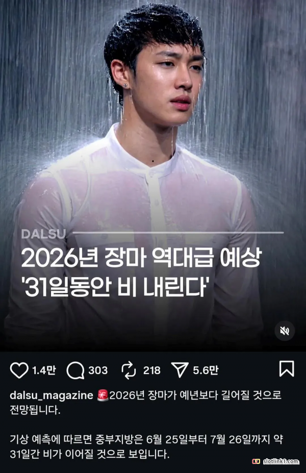 2026년 장마 역대급 예상 '31일동안 비 내린다' 페이지 정보 작성자 fiveou 댓글 0건 조회 256회 작성일 26-04-15 17:21 목록 답변 글쓰기 본문 네 제가요?아닌데요?요즘 인스타에 적당한 AI사진 붙인 출처불명 뉴스들이 많은데 조심하시길 이전글만국공통) 억울한 산부인과 남자의사 26.04.15 다음글 합리적이며 공정공평한 재판제도는 있는가 26.04.15 댓글 0 댓글목록 등록된 댓글이 없습니다.