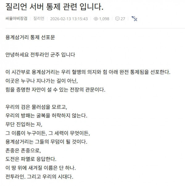 [유머] 낭만 오지는 리니지 클래식 근황. 페이지 정보 작성자 fiveou 댓글 0건 조회 147회 작성일 26-02-19 20:19 목록 답변 글쓰기 본문 하이고 할배요...크크 이전글[유머] 김병현 이름듣고 화들짝 놀라는 미국아저씨 26.02.19 다음글[유머] 컬링팀 이름의 비밀 26.02.19 댓글 0 댓글목록 등록된 댓글이 없습니다.